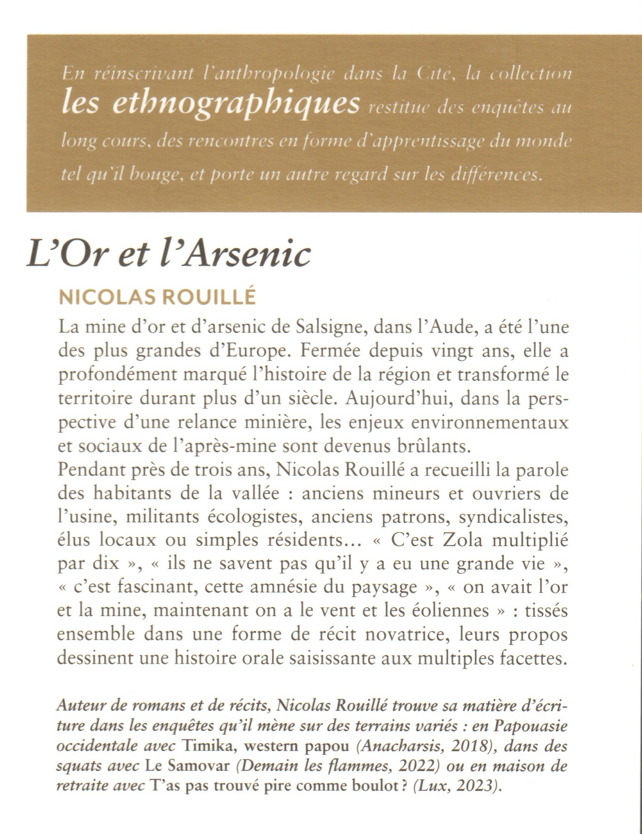 Nicolas Rouillé, auteur de romans et de récits, trouve sa matière d’écriture dans les enquêtes qu’il mène sur des terrains variés : en Papouasie occidentale avec Timika. Western papou (Anacharsis, 2018), dans des squats avec Le Samovar (Demain les flammes, 2022), en maison de retraite avec T’as pas trouvé pire comme boulot ? (Lux, 2023), et dans l’Aude avec son ouvrage sur la mine de Salsigne.